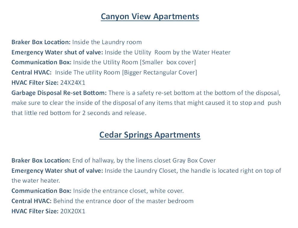 We know how important is to know the basics of your new Apartment Home, please get to know your unit in a way that you know how to react in the event of an emergency, a basic operation, or information needed to maintain your furnace running smoothly.